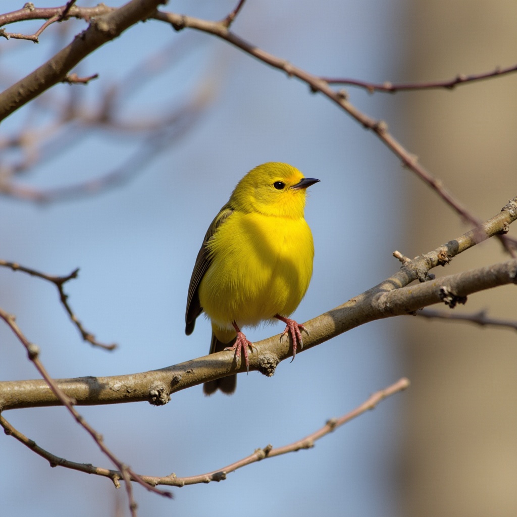 avian, bare branches, bird, birdwatching, black beak, blue sky, feathers, nature, orange legs, perched bird, small bird, songbird, spring bird, tree branch, warbler, wild bird, wildlife, yellow bird, yellow warbler
