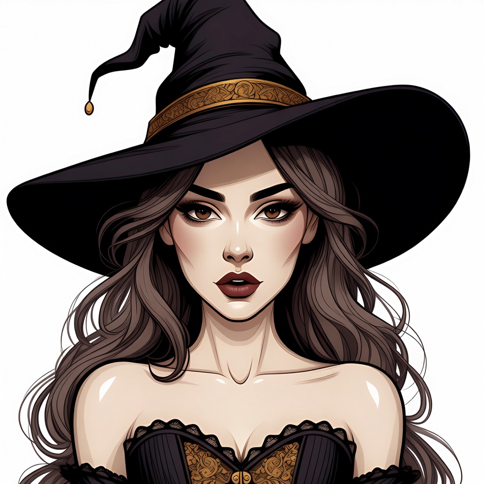 An illustration of a young woman with long wavy brown hair wearing a large black pointed witch hat with gold trim. She has striking makeup with dark eyes and red lips, and a low-cut black corset dress with gold accents. Her portrait is set against a white background.