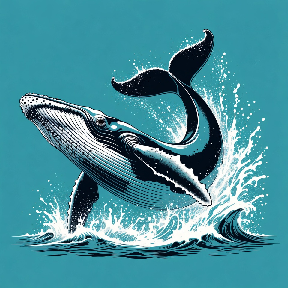 A detailed illustration of a humpback whale leaping out of the ocean with water splashing around it. The whale features distinctive white markings on its dark body and a large tail fluke. It is set against a solid teal background with white waves.