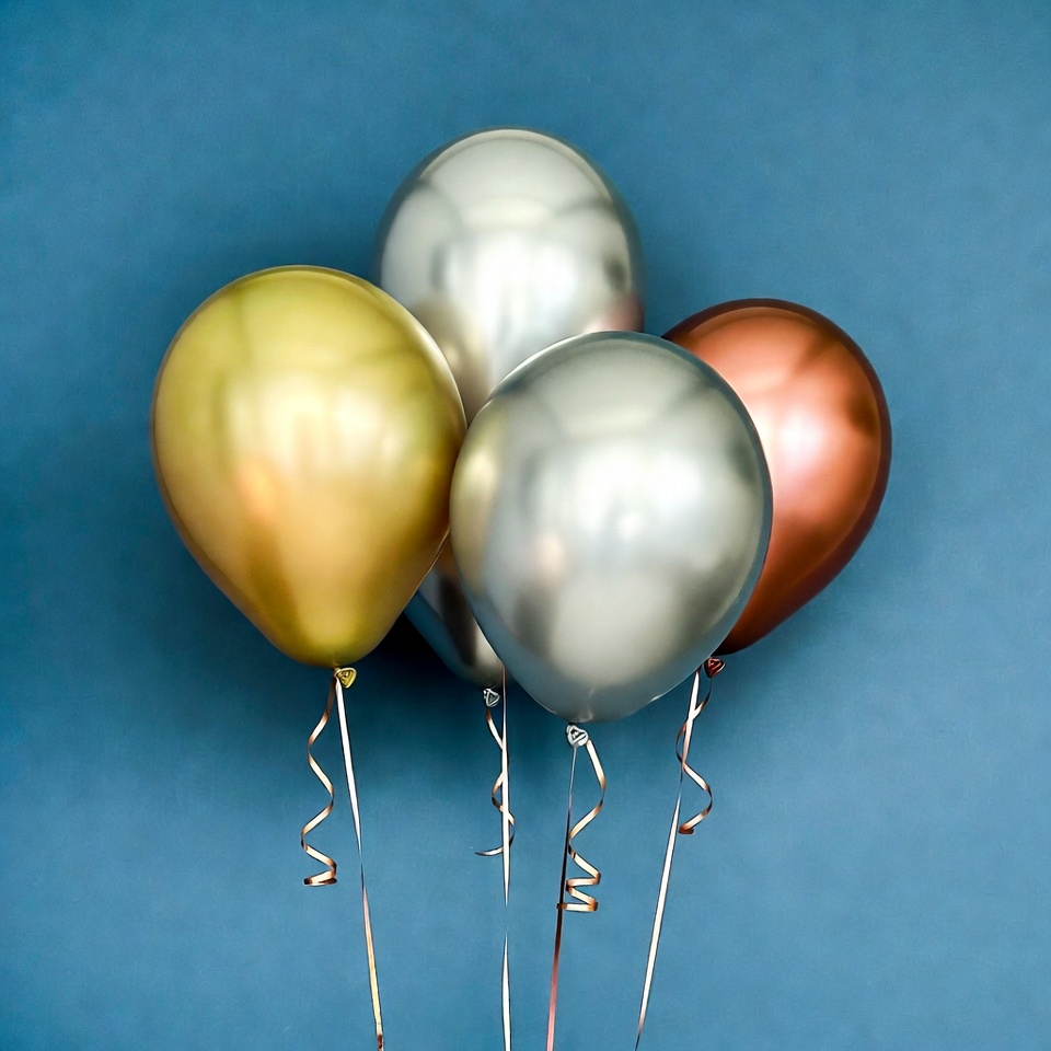 Four metallic balloons in gold, silver, and bronze colors float against a solid blue background. Each balloon has a curly ribbon attached to its string. They are clustered together in a bunch.