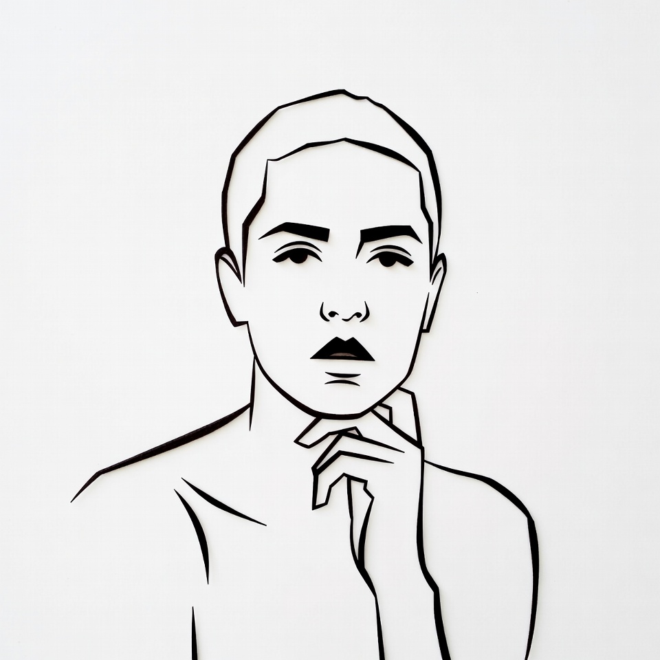 A black line art illustration of a woman with short hair and bold lips, hand resting on her chin in a thoughtful pose. She faces forward against a white background. The minimalist drawing features clean outlines and subtle shading.