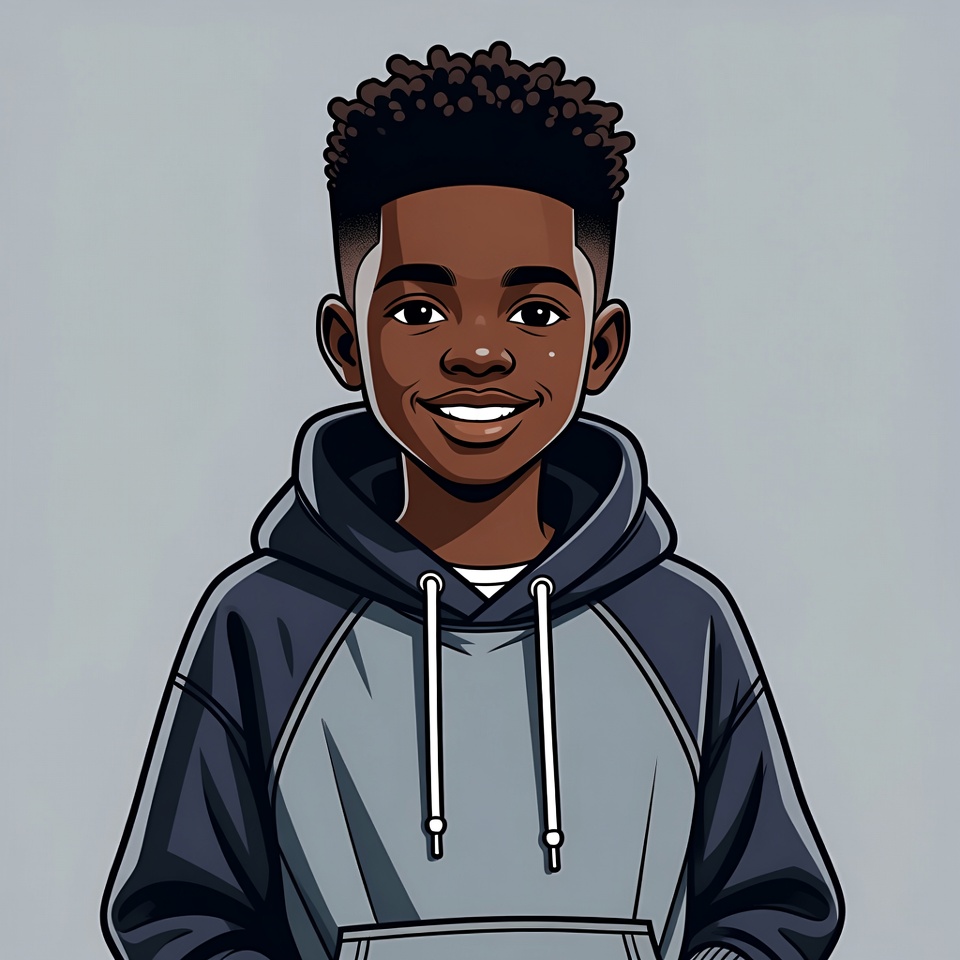A cartoon illustration of a young African-American boy with a curly fade haircut smiles at the viewer. He wears a navy and gray hooded sweatshirt with white drawstrings over a white shirt. The boy stands against a plain light gray background.