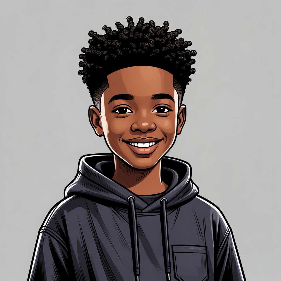A cartoon illustration of a young African-American boy with curly hair smiles at the viewer. He wears a dark hooded sweatshirt with the hood down. The image features a plain gray background.