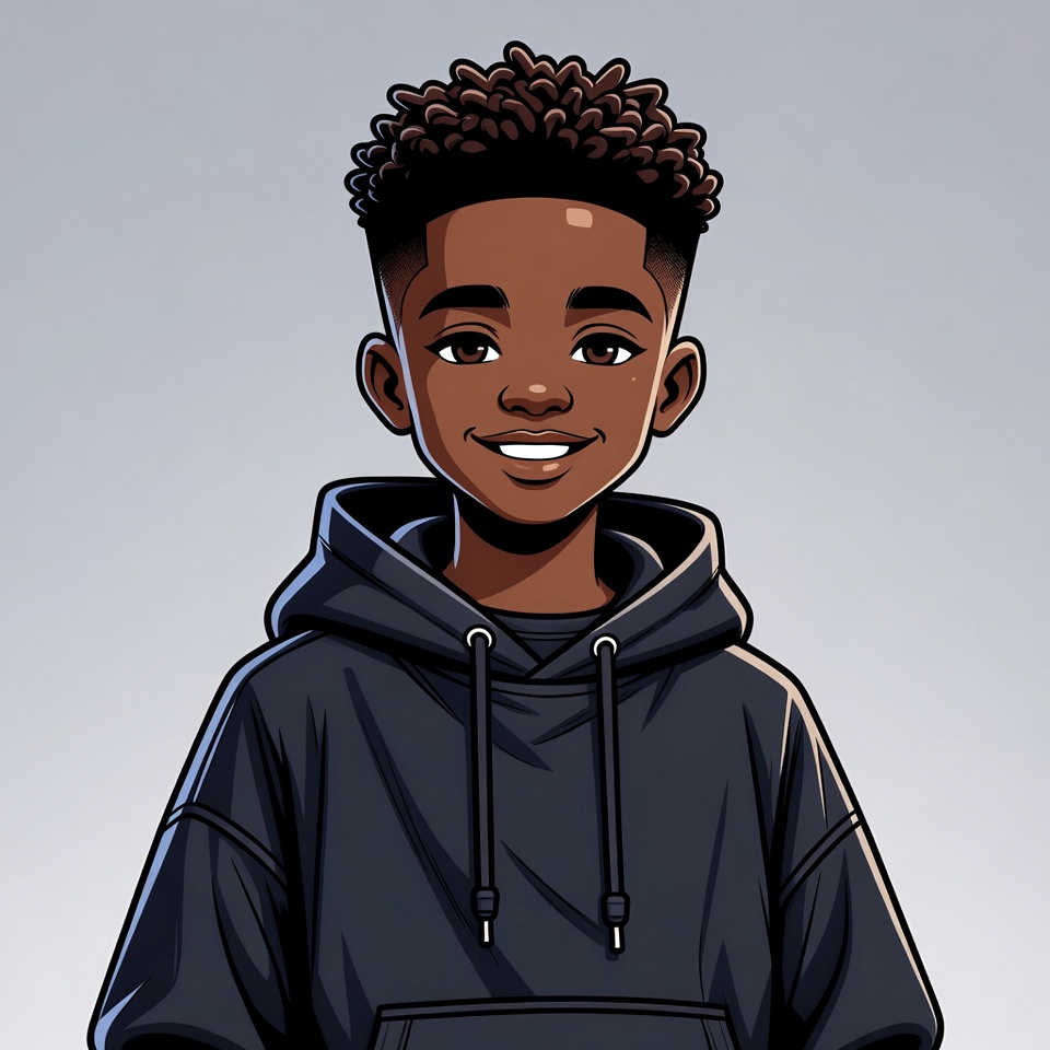 A cartoon illustration of a young African-American boy with curly hair smiles at the viewer. He wears a black hoodie with the hood up and stands against a plain light gray background. His large expressive eyes and cheerful expression are prominently featured.