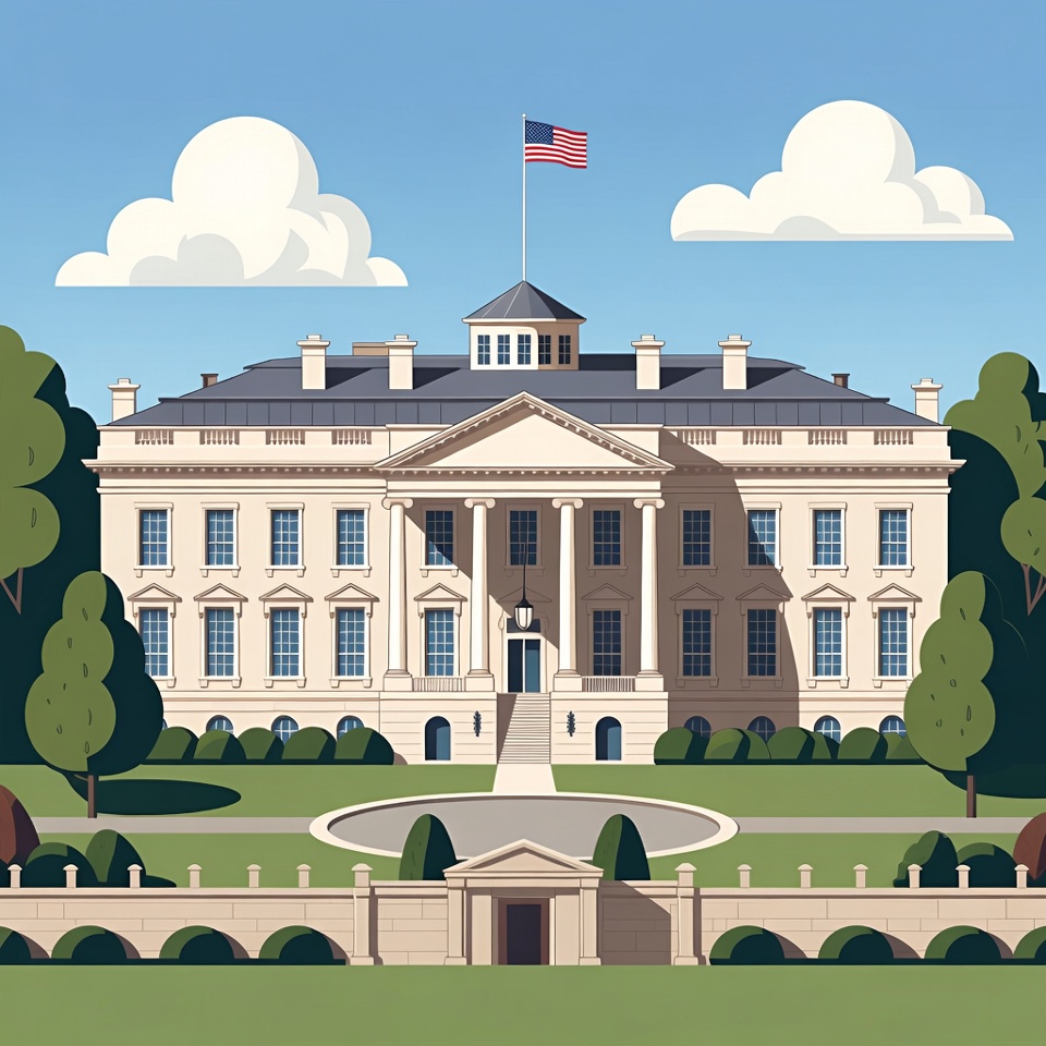 A flat illustration of the White House features the iconic white building with columns, a central dome, and the American flag flying atop. Fluffy white clouds float in the blue sky above lush green trees and manicured lawns surrounding the structure. A circular driveway and hedges frame the front entrance.