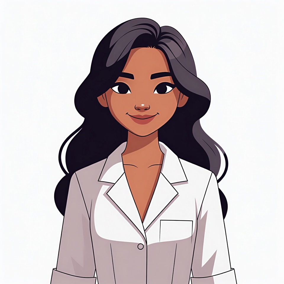 Asian, beautiful, black hair, brown skin, dark eyes, digital art, female, happy expression, illustration, isolated background, long hair, portrait, smiling, wavy hair, white coat, young woman, woman