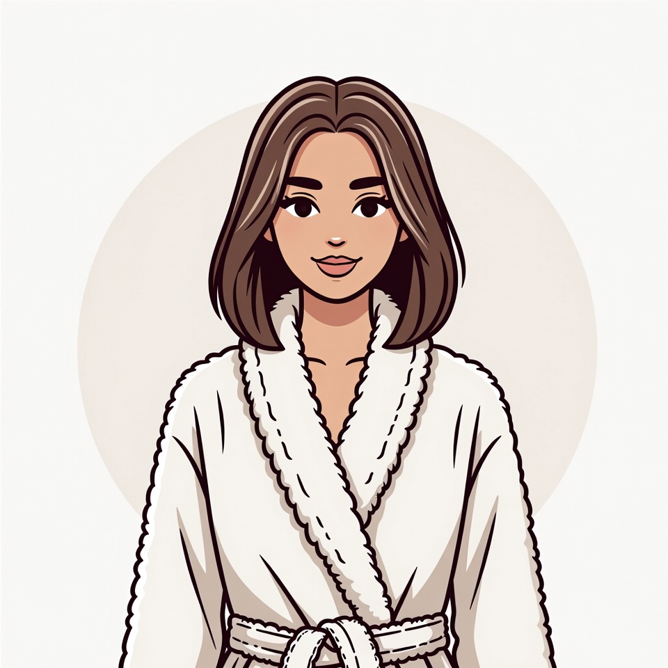 A young woman with shoulder-length brown hair smiles gently while wearing a fluffy white bathrobe. The bathrobe features a belted waist and fur-trimmed edges. She stands against a light beige circular background in a clean vector illustration style.
