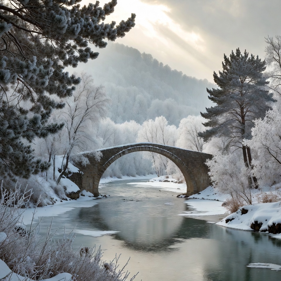 A picturesque stone arch bridge spans a calm, icy river surrounded by snow-covered pine trees and hills. Sunlight rays break through the cloudy sky, illuminating the frosted landscape. The bridge's reflection shimmers in the partially frozen water.