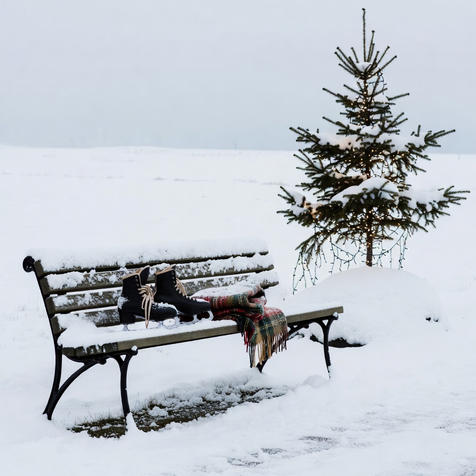 Snowy Bench with Boots and Christmas Tree