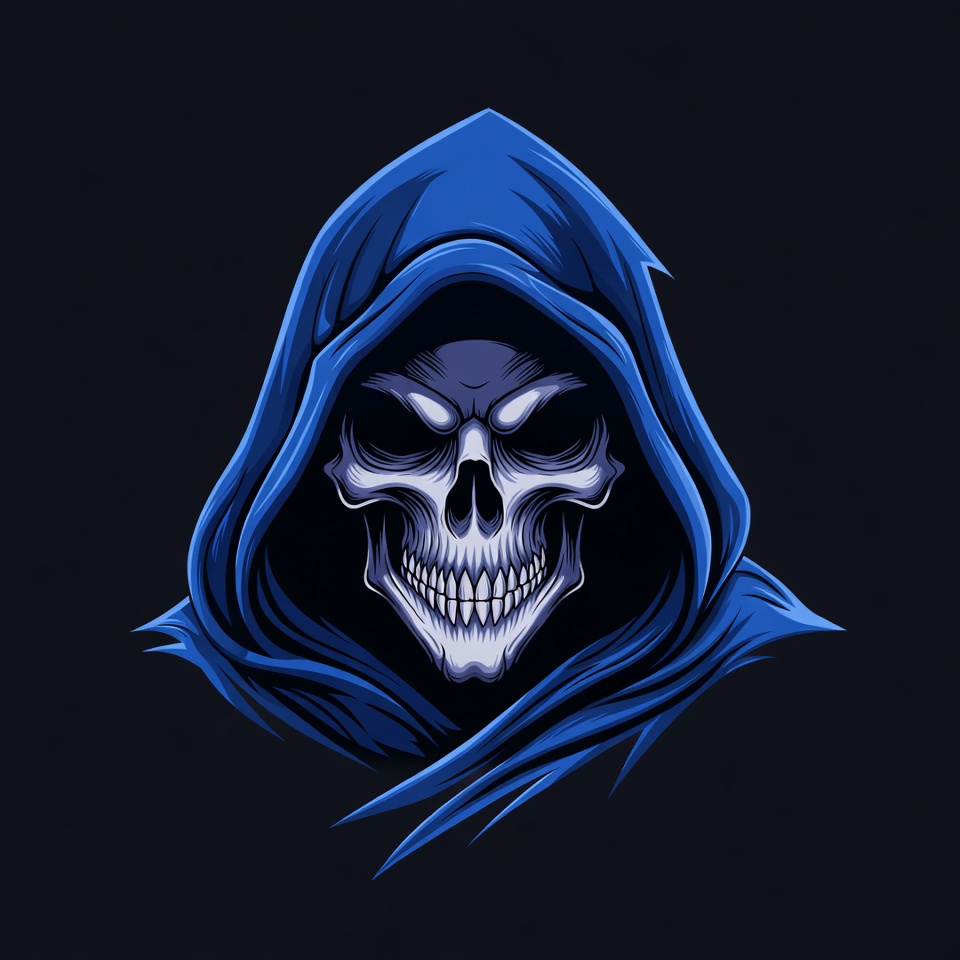 A digital illustration features a menacing white skull with sharp teeth and glowing eyes inside a flowing blue hood. The skull grins intensely against a solid black background. Bold white outlines and blue shading create a dramatic, glowing effect.