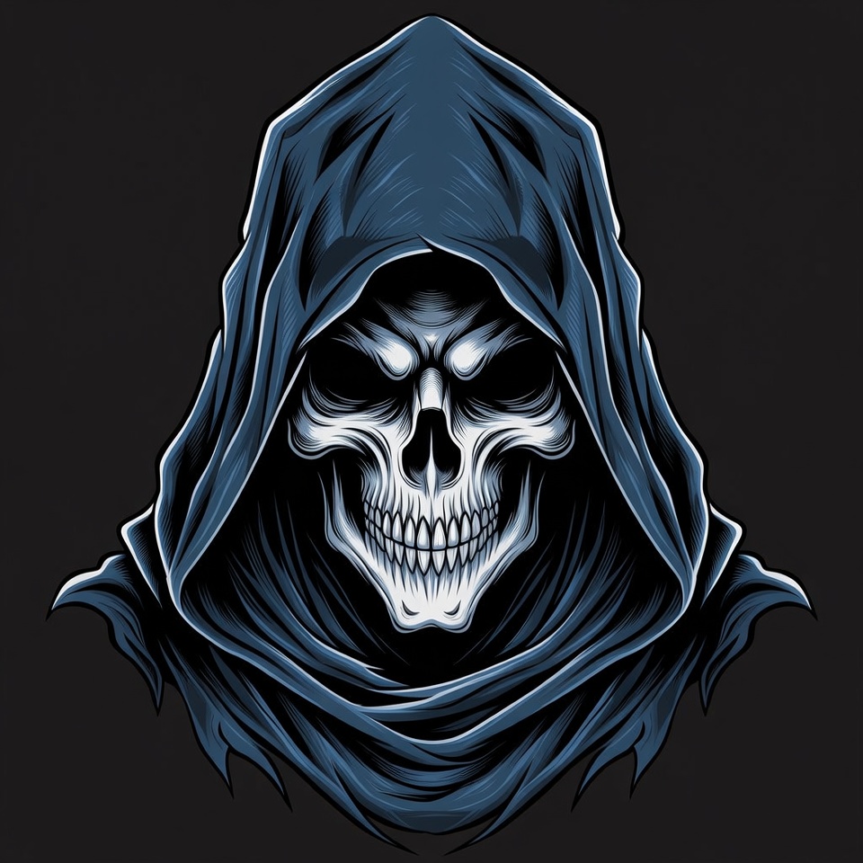 A digital illustration features a white human skull with a wide grinning mouth and glowing eyes inside a dark hooded cloak. The hood frames the skull tightly against a black background. Detailed shading and highlights give it a dramatic, ominous appearance.