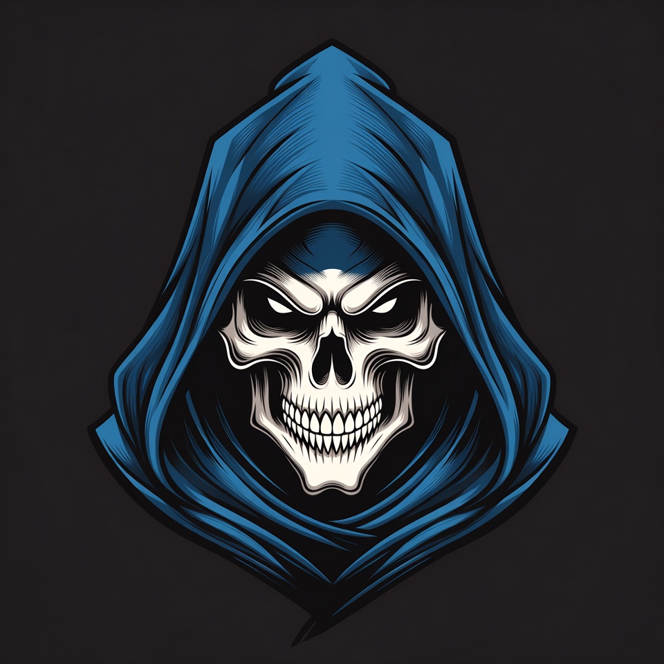 A detailed digital illustration features a menacing white skull with glowing eyes and sharp teeth, shrouded in a flowing blue hood. The skull is centered against a solid black background, with bold white outlines and shadows creating a dramatic effect. The hood drapes symmetrically around the skull's face.