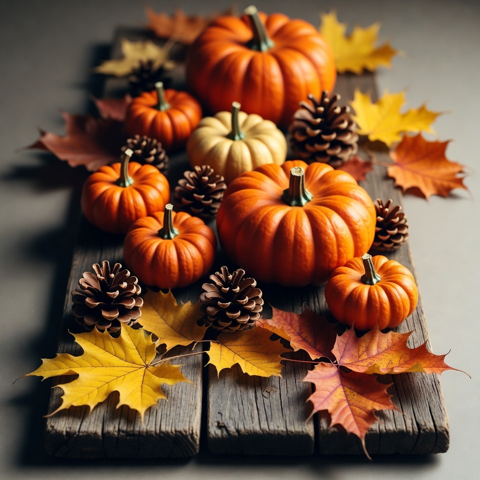 A collection of orange pumpkins in various sizes is arranged on a rustic wooden board. Vibrant yellow and orange autumn leaves and pine cones are scattered among the pumpkins. The composition creates a festive fall harvest display against a dark background.