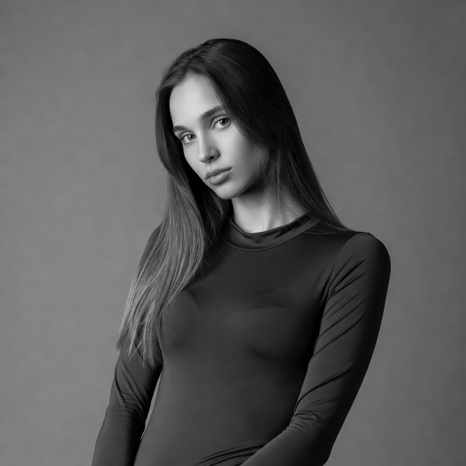 beautiful woman, black and white, black top, closeup, dark hair, elegant, fashion portrait, female, gray background, headshot, long hair, long sleeves, monochrome, portrait, serious expression, slim figure, straight hair, studio photo, young woman, woman