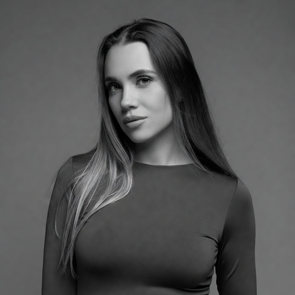 A young woman with long straight brown hair highlighted with blonde tips poses for a close-up portrait. She wears a form-fitting black long-sleeve top and gazes slightly to the side with a subtle expression. The image is in black and white against a plain gray background.