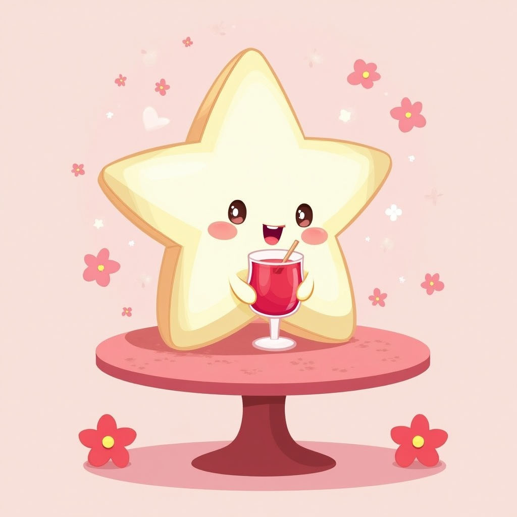 A kawaii illustration of a smiling white star-shaped cookie with big eyes holds a glass of red juice with a straw. It stands on a pink pedestal surrounded by floating pink flowers and sparkles. The background is a soft pink gradient.