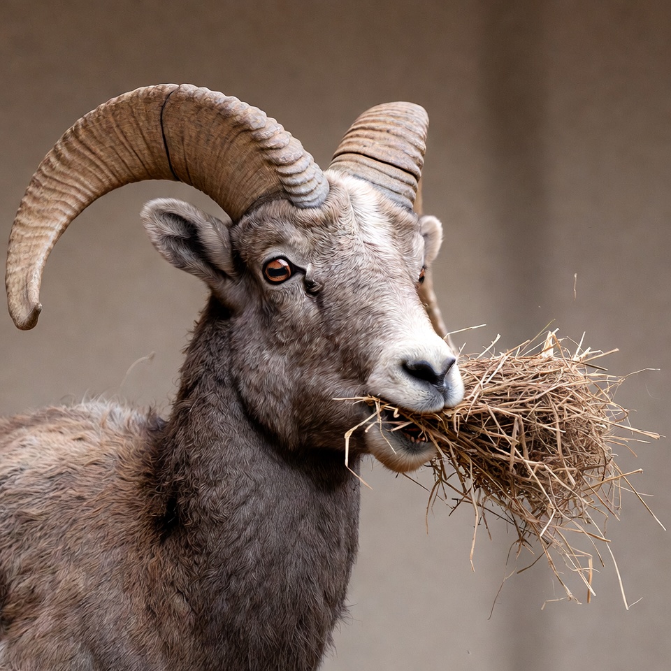 A bighorn sheep with large curved horns stands against a plain background, munching on a bundle of hay. Its gray woolly fur and alert orange eyes are prominently visible as it holds the hay in its mouth. The sheep faces the camera directly.