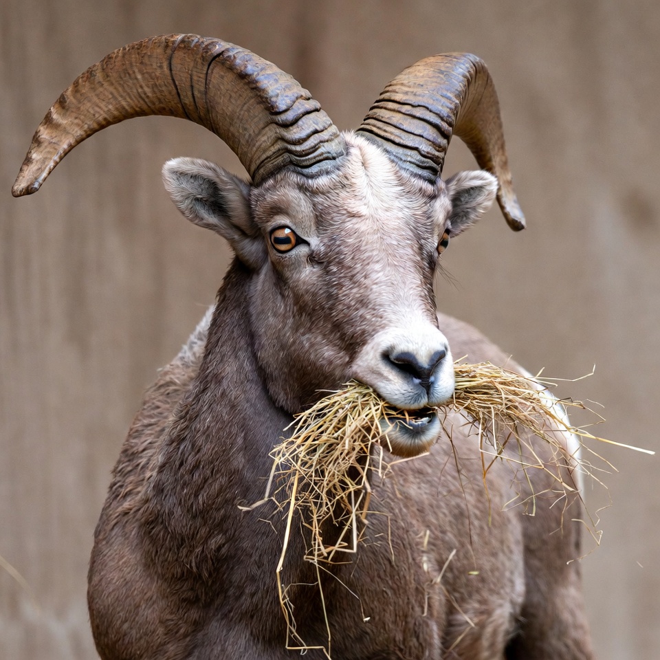 A bighorn sheep with large curved horns faces forward against a neutral background. It has light gray fur on its face and darker brown fur on its body. The sheep is eating hay from its mouth, with strands hanging down.