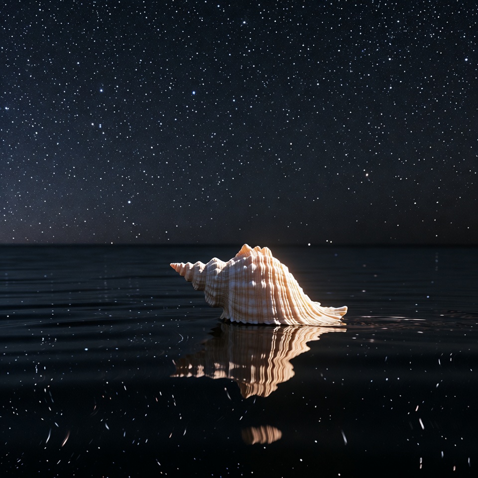 A large white conch seashell floats on calm water with its reflection visible below. A starry night sky filled with numerous stars surrounds the scene. The shell's textured surface stands out against the dark water and sky.