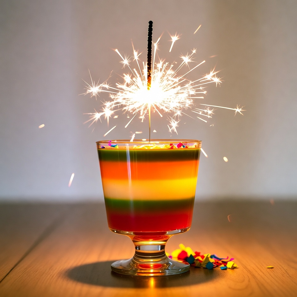 birthday sparkler, blue jelly, celebration, colorful layers, confetti, dessert glass, festive drink, food photography, glass goblet, green jelly, holiday treat, jelly glass, orange jelly, parfait, party dessert, rainbow layers, red jelly, sparkler, sparks, wooden table, yellow jelly, layered dessert