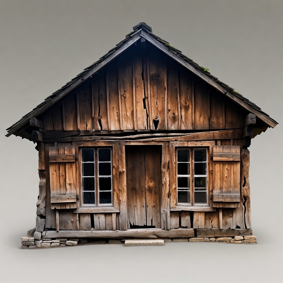 architecture, brown wood, cabin exterior, chalet, gray roof, isolated background, old cabin, rural house, rustic cabin, shingled roof, small house, stone foundation, traditional cabin, weathered wood, windows, wooden cabin, wooden door, wooden house, wooden shutters, log cabin