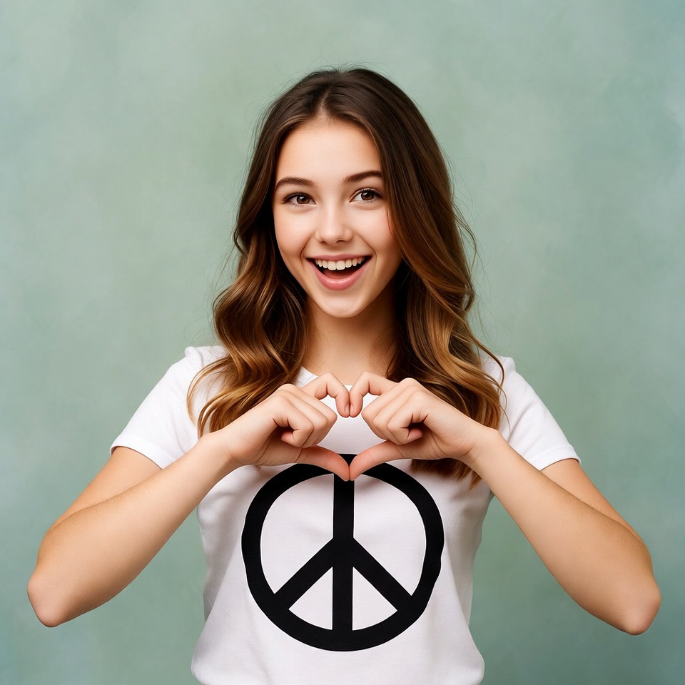 A young girl with long wavy brown hair smiles widely while forming a heart shape with her hands over her chest. She wears a white t-shirt featuring a large black peace symbol. The image is set against a light green background.