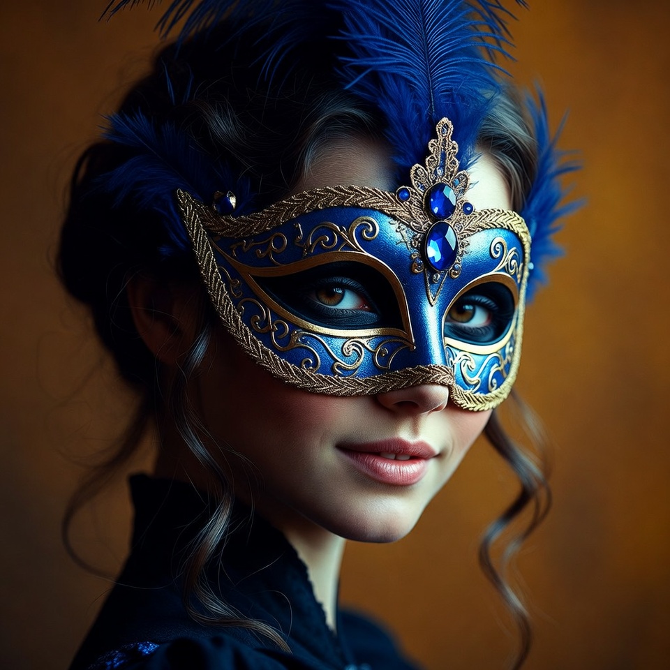 A young woman with dark curly hair wears an ornate blue Venetian mask adorned with feathers and gold accents. Her eyes peer through the mask's intricate gold and blue filigree design featuring blue gemstones. She has a subtle smile and wears a dark elegant outfit against a warm blurred background.