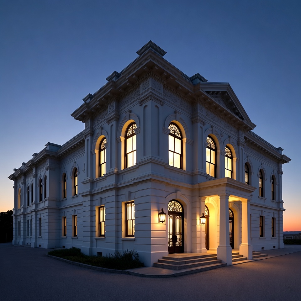 arched windows, architectural details, architecture, building lights, classical architecture, corner building, dusk, elegant mansion, evening light, grand entrance, heritage building, historic building, illuminated building, landscape surroundings, lanterns, lit windows, luxury home, mansion at night, mansion doorway, mansion exterior, old mansion, ornate facade, paved courtyard, steps entrance, stone mansion, sunset glow, twilight, white mansion, Victorian mansion