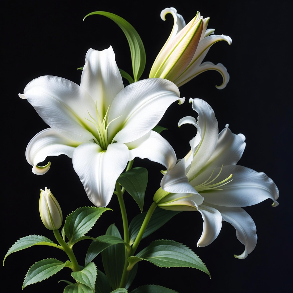 A cluster of elegant white lilies with green leaves stands against a solid black background. The flowers feature curved petals and prominent stamens, with one bud visible nearby. The composition highlights the purity and detail of the blooms.