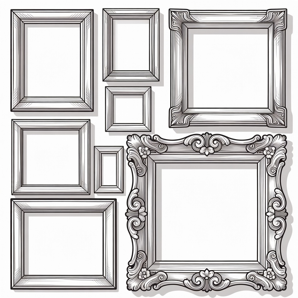 A collection of various empty picture frames in different sizes and styles is arranged on a white background. The frames feature ornate designs with decorative edges and corners. All frames are line art illustrations with blank interiors.
