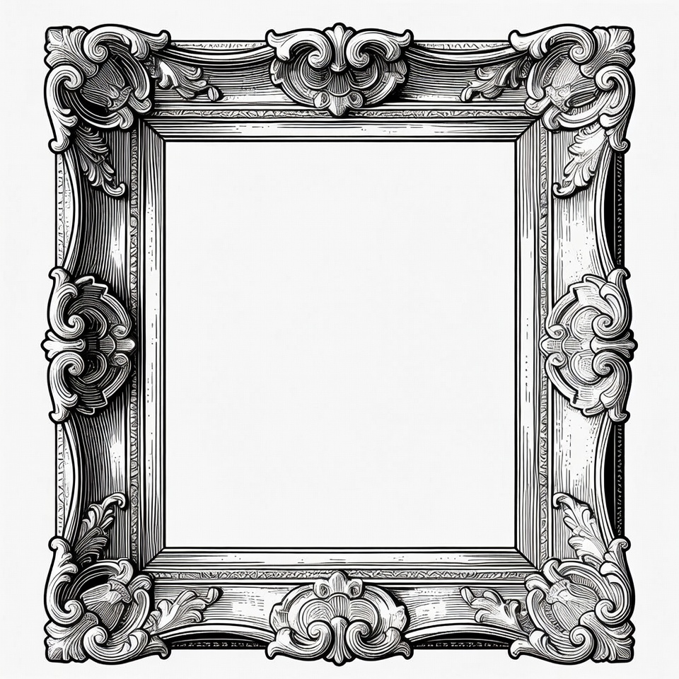 antique frame, baroque frame, clipart, decorative border, empty frame, engraving, filigree, illustration, isolated background, line art, ornate frame, rococo design, scrollwork, silver frame, vintage frame, picture frame