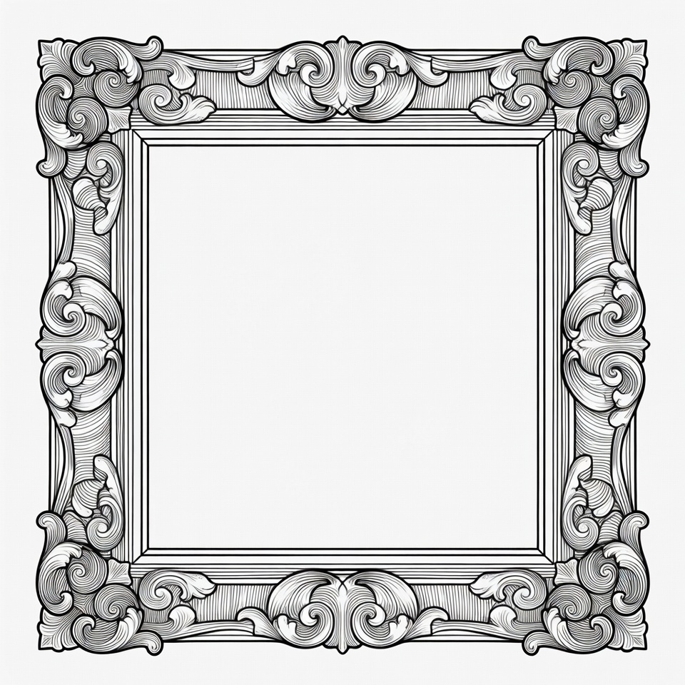 A highly detailed black and white illustration of an ornate picture frame with intricate scrollwork and floral motifs. The frame features elaborate curves and flourishes on all sides, surrounding a completely empty white space inside. It has a vintage baroque style with fine line art detailing.