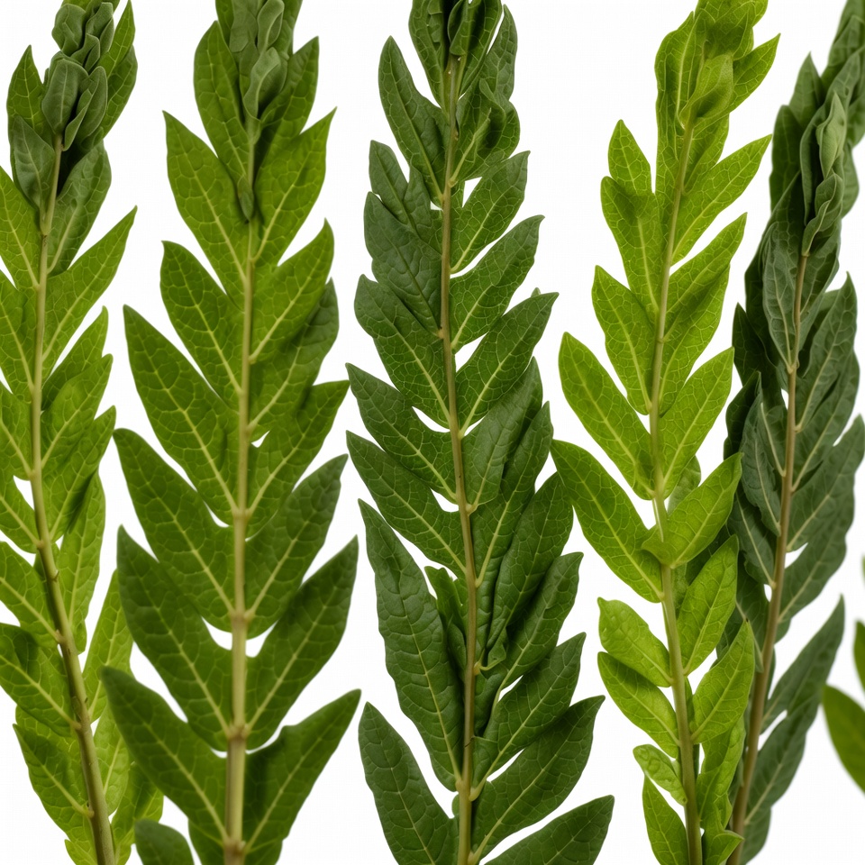 Several vibrant green fern leaves with pinnate fronds stand upright against a plain white background. The leaves feature detailed serrated edges and varying shades of green. They are arranged in a cluster, isolated for clear visibility.