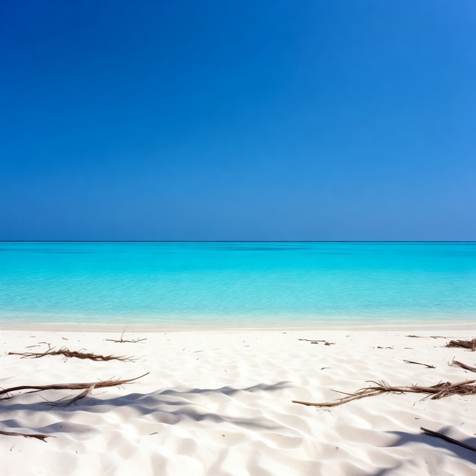 A pristine white sand beach meets vibrant turquoise ocean waters under a clear blue sky. Scattered seaweed and shadows lie on the foreground sand. The horizon shows calm sea extending to the sky.