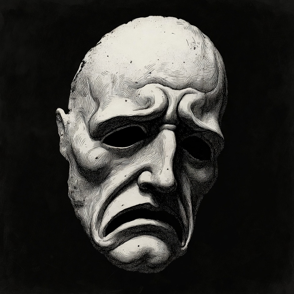 A detailed drawing of a white tragedy mask with a frowning expression is centered against a black background. The mask features deep wrinkles, furrowed brows, and downturned mouth. It has a classical sculpted appearance with fine line work.