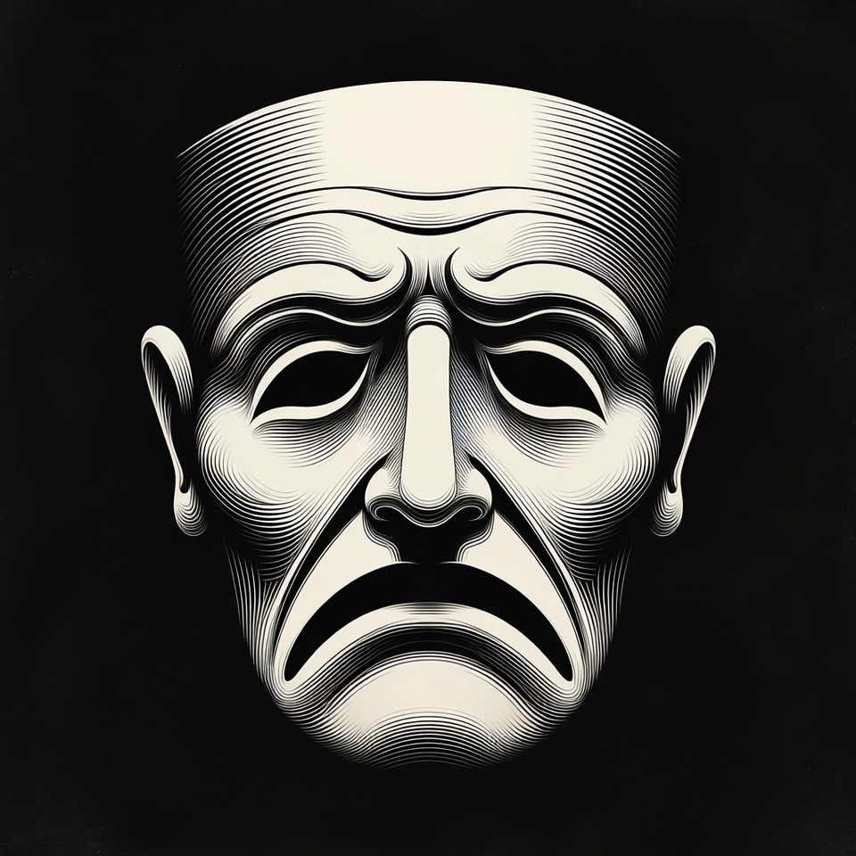 A detailed line art illustration of a white tragedy theater mask with a frowning expression is centered on a black background. The mask features deep creases on the forehead, downturned eyes, and a wide open mouth in sorrow. It is rendered in a classic contoured style with smooth gradients.