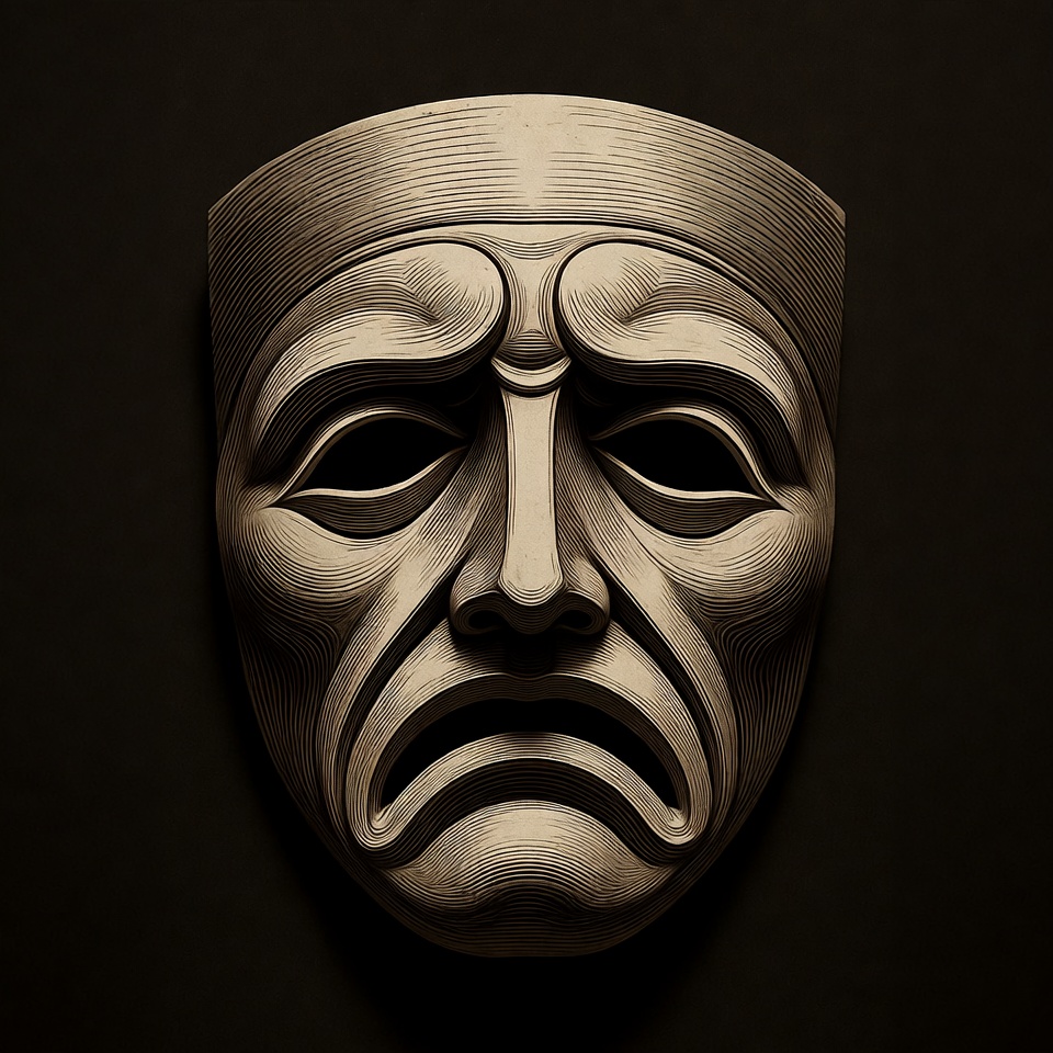A detailed ancient Greek tragedy mask with a frowning expression is centered against a dark background. The mask features deeply carved eyes, furrowed brows, and an open downturned mouth. Its beige sculpted surface shows intricate line details typical of classical theater masks.