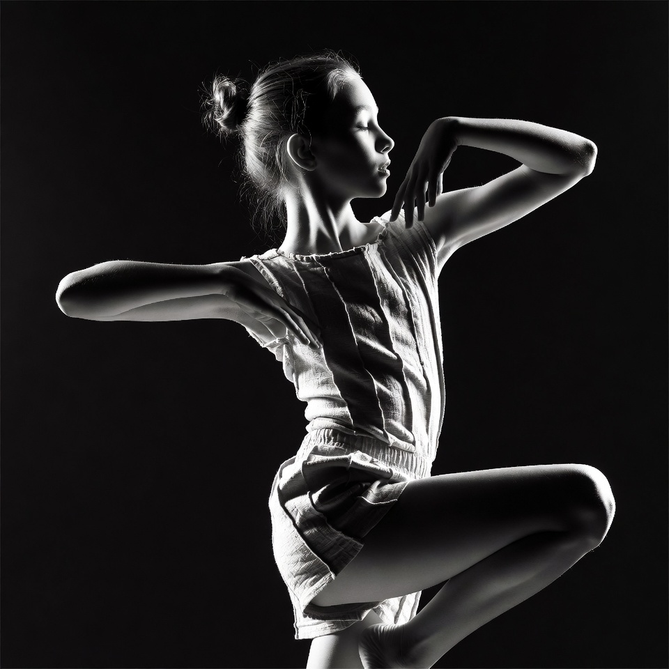 A young girl with her hair in a bun performs a graceful ballet pose in black and white. She wears a sleeveless top and shorts, standing on one leg with arms elegantly extended. The image features a dark background highlighting her silhouette.