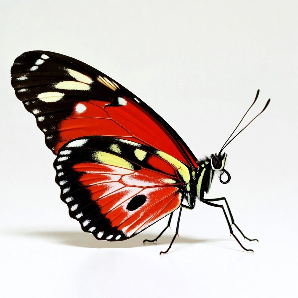 A vibrant red butterfly with black and white spotted wings is perched with wings spread open. Its detailed patterns include yellow spots and black edges on the red wings. The butterfly stands on thin legs against an isolated white background.