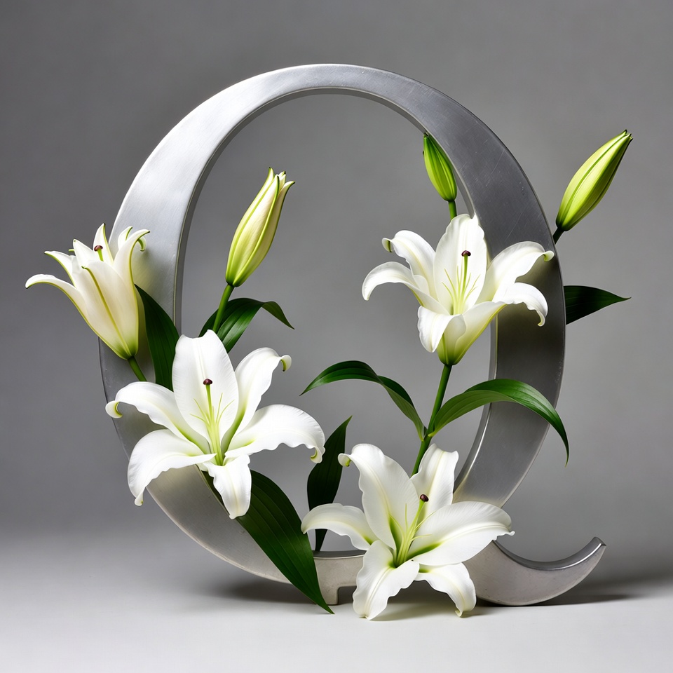 White lilies with green stems are arranged around and inside a large metallic silver letter Q. The flowers bloom vibrantly against the gray background. The composition forms an elegant floral display shaped by the Q structure.