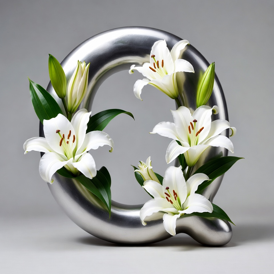 Q shape, blooming lilies, floral arrangement, floral design, flower ring, green leaves, isolated background, letter Q, lily flowers, metallic Q, shiny metal, silver ring, silver sculpture, white flowers, white lilies