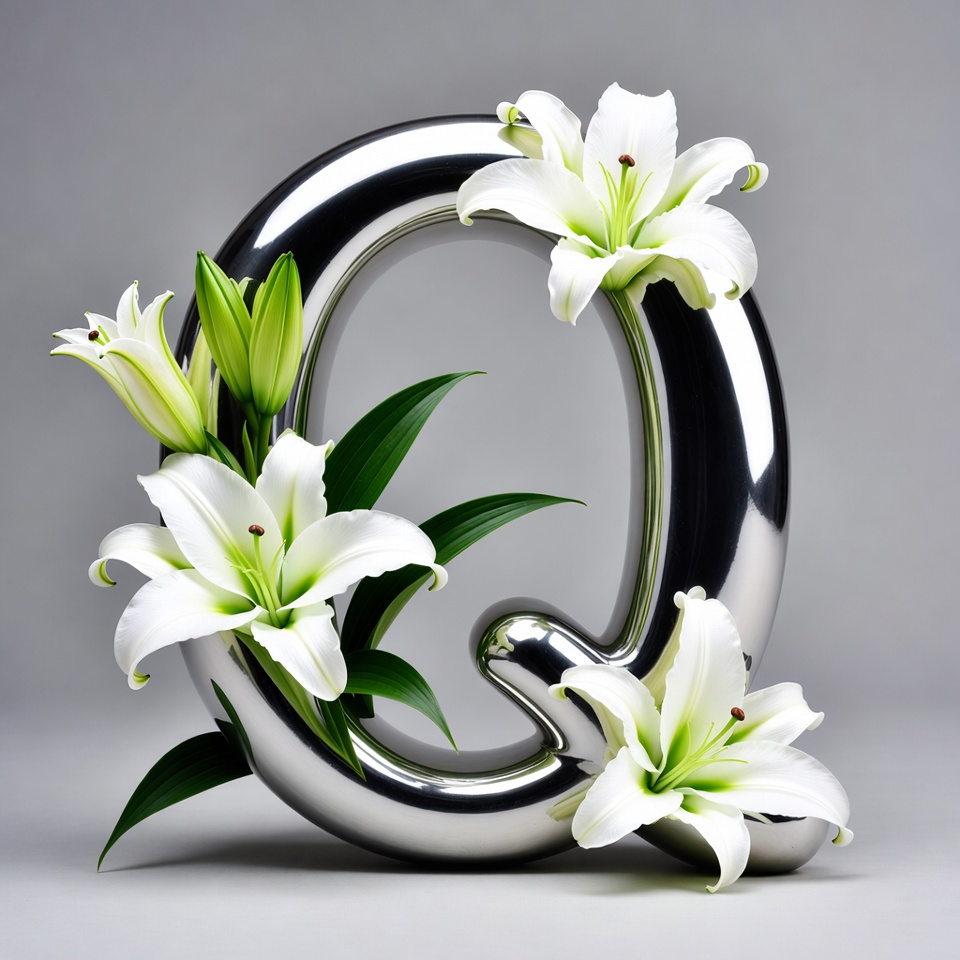 White lilies with green leaves are artistically arranged around a shiny metallic letter Q. The flowers bloom vibrantly against the smooth silver surface of the Q. The composition is set against a plain gray background.