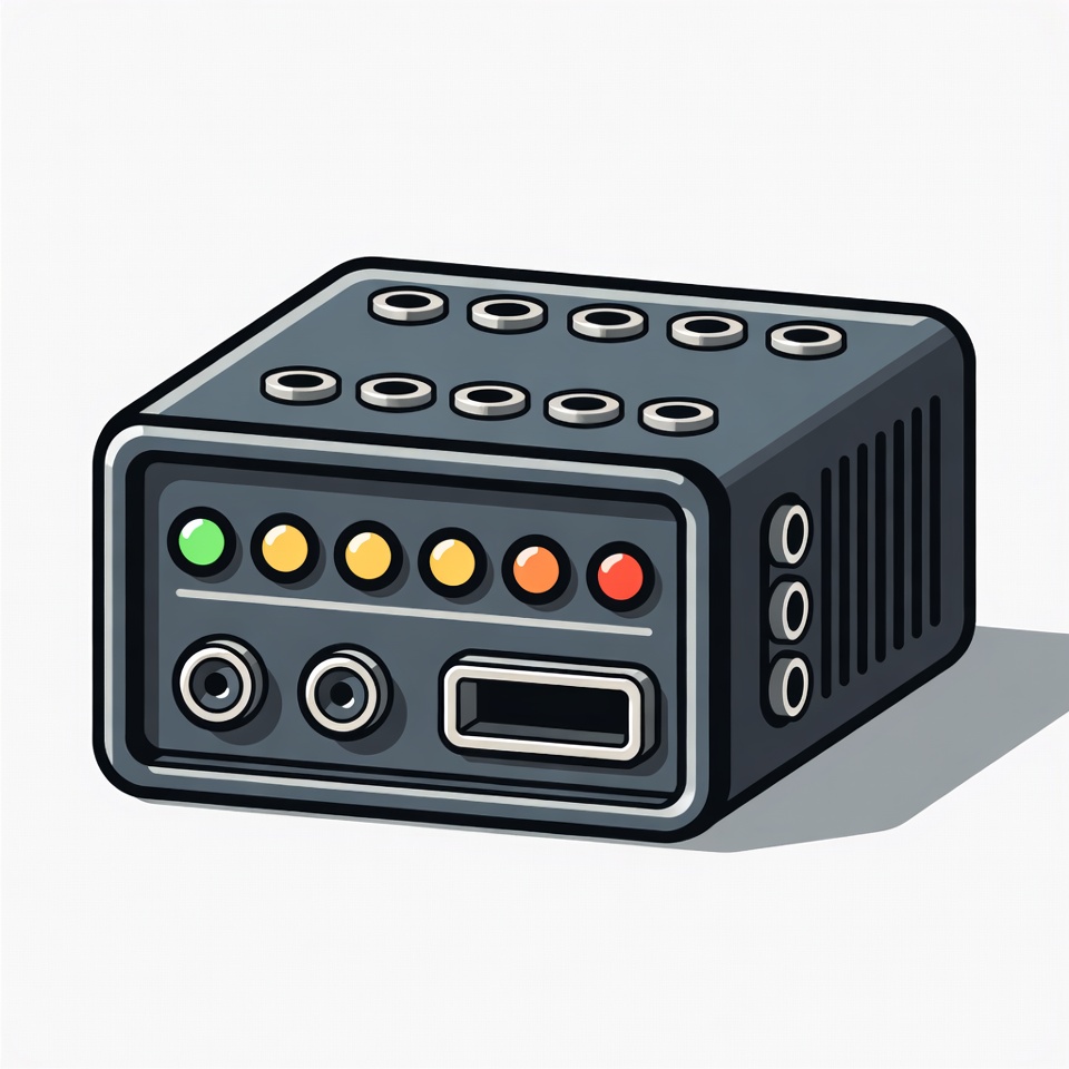 A clipart illustration of a black audio mixer box on a white background. It features five colored LED indicator lights: green, two yellows, and a red light. The mixer has multiple input jacks, output ports, and ventilation slots.