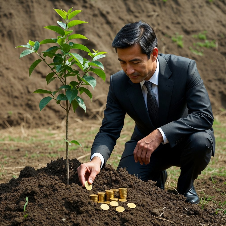A man in a dark suit kneels beside a small green sapling in soil, gently touching it with one hand. Golden coins are stacked around the base of the plant on the dirt mound. He has short dark hair and wears a white shirt with a tie.