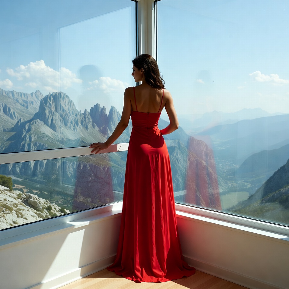 A woman with long dark hair stands with her back to the camera, wearing a flowing red spaghetti-strap dress. She leans on a glass railing inside a modern room with wooden floors, gazing out at a panoramic view of rugged snow-capped mountains and valleys under a clear blue sky. The expansive window frames the stunning alpine landscape.