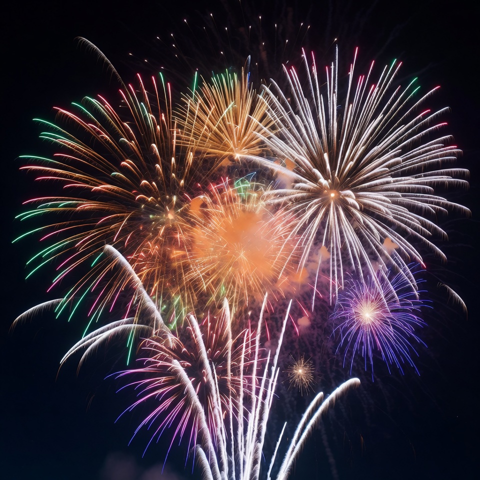 blue fireworks, bursts, celebration, colorful fireworks, dark background, exploding fireworks, festival, fourth of july, green fireworks, holiday fireworks, light trails, new year, night sky, orange fireworks, purple fireworks, pyrotechnics, red fireworks, sky display, sparks, trails, vibrant colors, white fireworks, fireworks