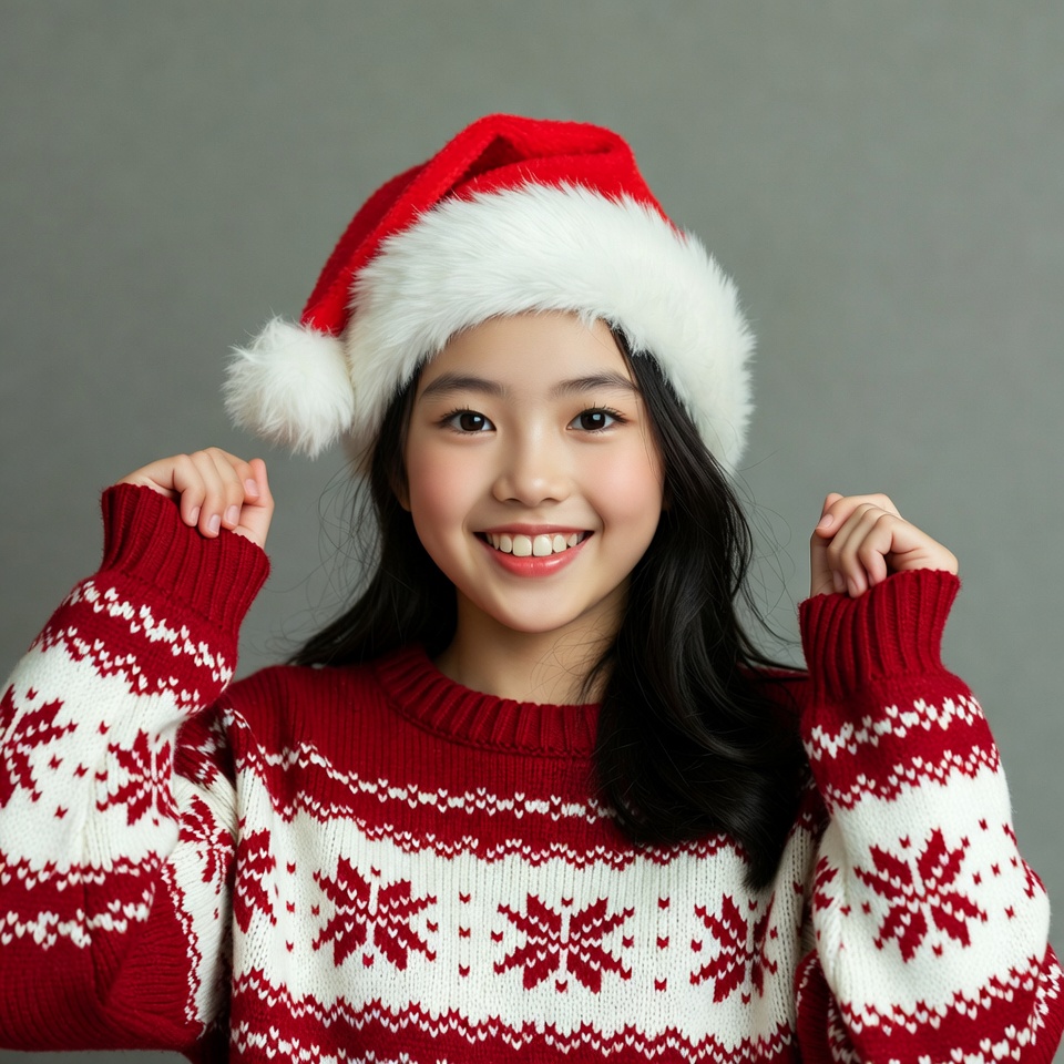 Christmas, Christmas sweater, Santa hat, cheerful, cute girl, female, festive, girl, gray background, happy expression, holiday, isolated background, joyful, knitted sweater, long black hair, portrait, raised hands, red sweater, smiling, snowflake pattern, white fur, winter fashion, young girl, Asian girl