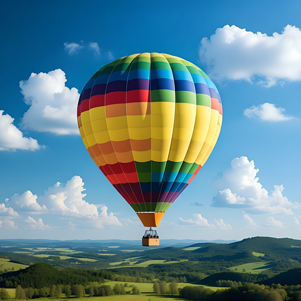 A vibrant rainbow-striped hot air balloon floats high in a clear blue sky with scattered white clouds. Lush green valleys, fields, and forested mountains stretch out below. The balloon's basket hangs beneath the colorful canopy.