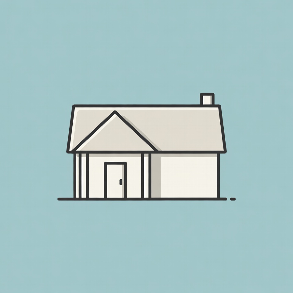 A minimalist line drawing of a house with a sloped roof, chimney, and front door. The house features clean white outlines on a solid light blue background. It has a simple rectangular shape with subtle shading.