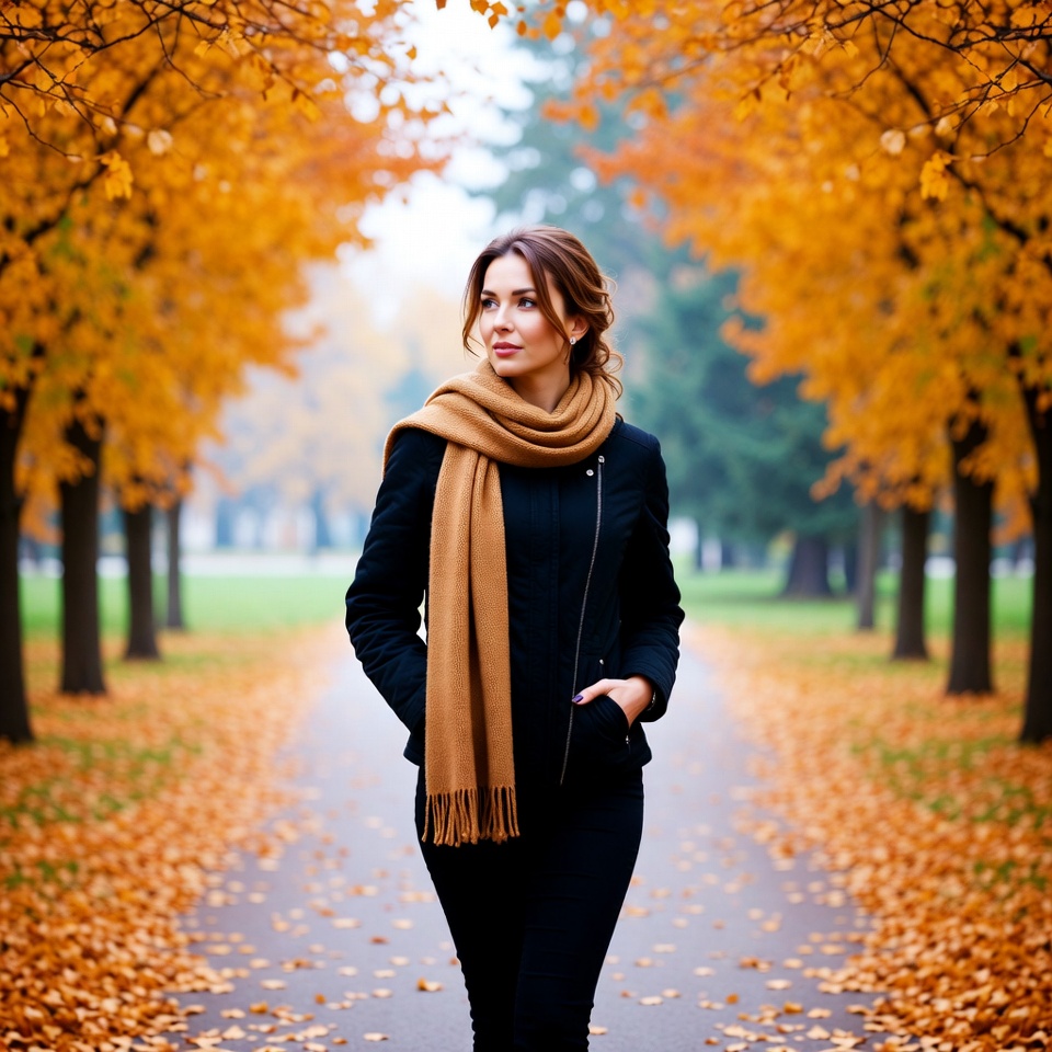 A woman with brown hair styled in an updo walks down a tree-lined path surrounded by vibrant orange and yellow autumn foliage. She wears a camel-colored scarf draped over a black leather jacket and black pants, with hands in her pockets. Fallen leaves cover the ground, and trees form an archway ahead.